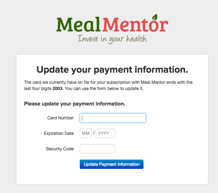 Once you are logged into your account on getmealplans.com. You can change your credit card on your Dashboard.